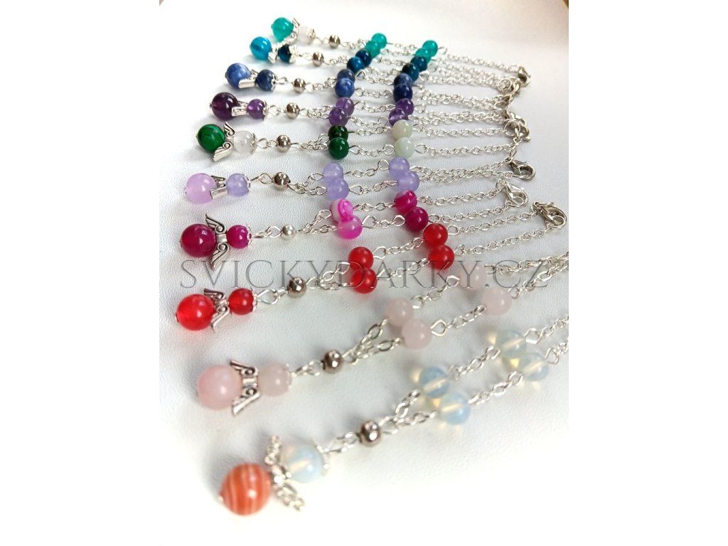 Růženec do auta je vyrobený z minerálních kuliček s andílkem, má zapínání, pro snadné přichycení do interiéru auta - zpětné zrcátko, topení, řadící páka, ...