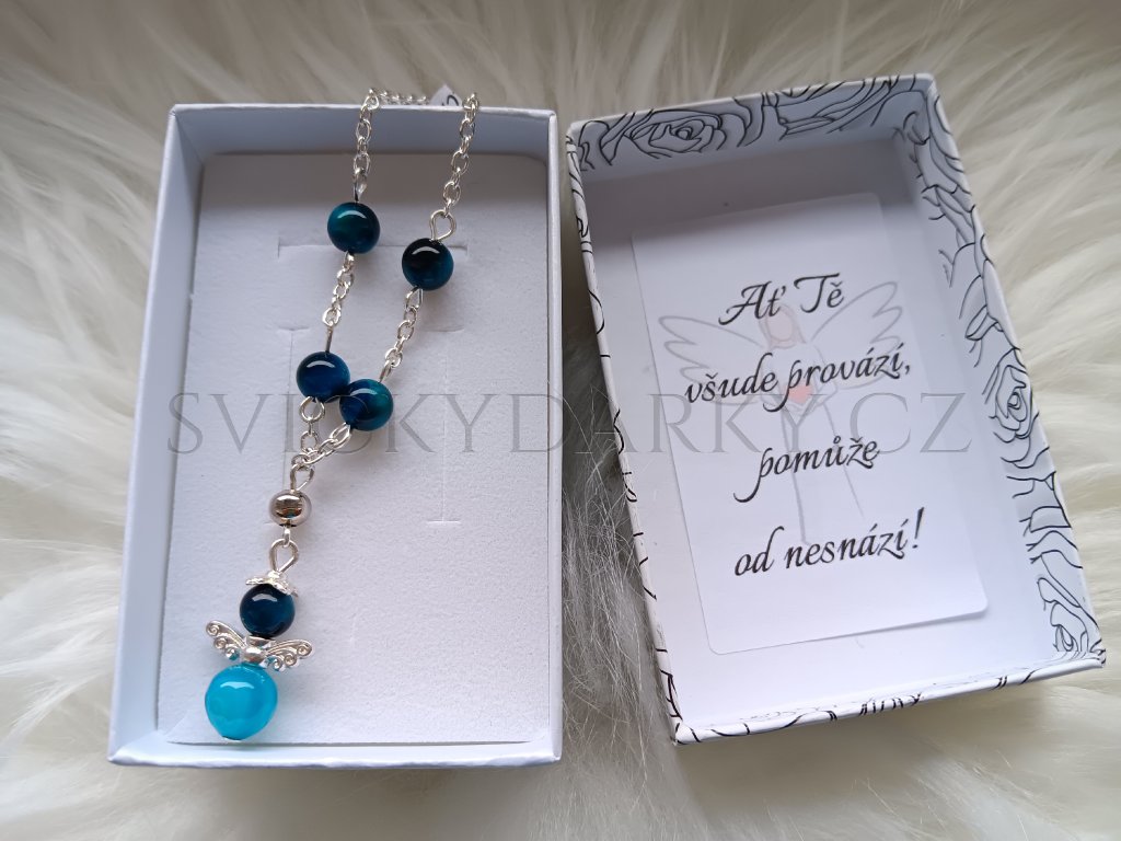 Růženec do auta je vyrobený z minerálních kuliček s andílkem, má zapínání, pro snadné přichycení do interiéru auta - zpětné zrcátko, topení, řadící páka, ...